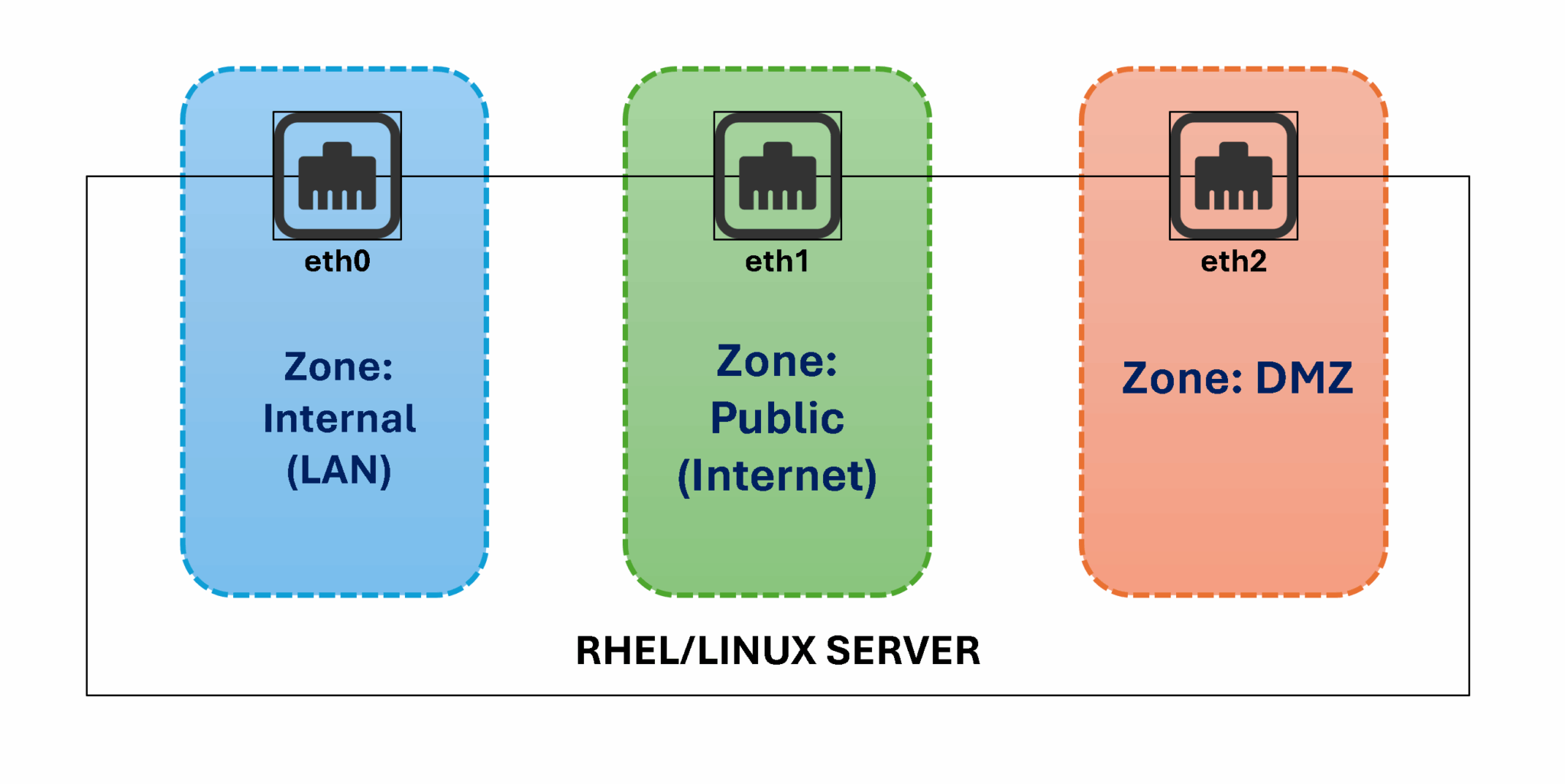 service uses a concept of zones. We can assign network interfaces to these zones and decide which kind of traffic can be filtered (what traffic can enter or not enter the host). We can use Network Manager to assign interfaces to particular zones using the firewall-cmd