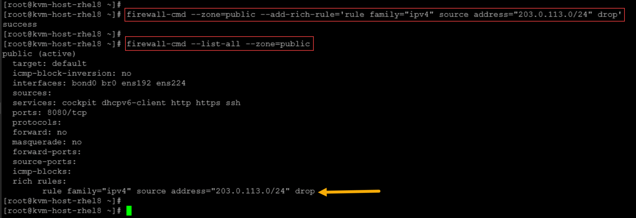firewall-cmd --zone=public --add-rich-rule='rule family="ipv4" source address="203.0.113.0/24" drop'