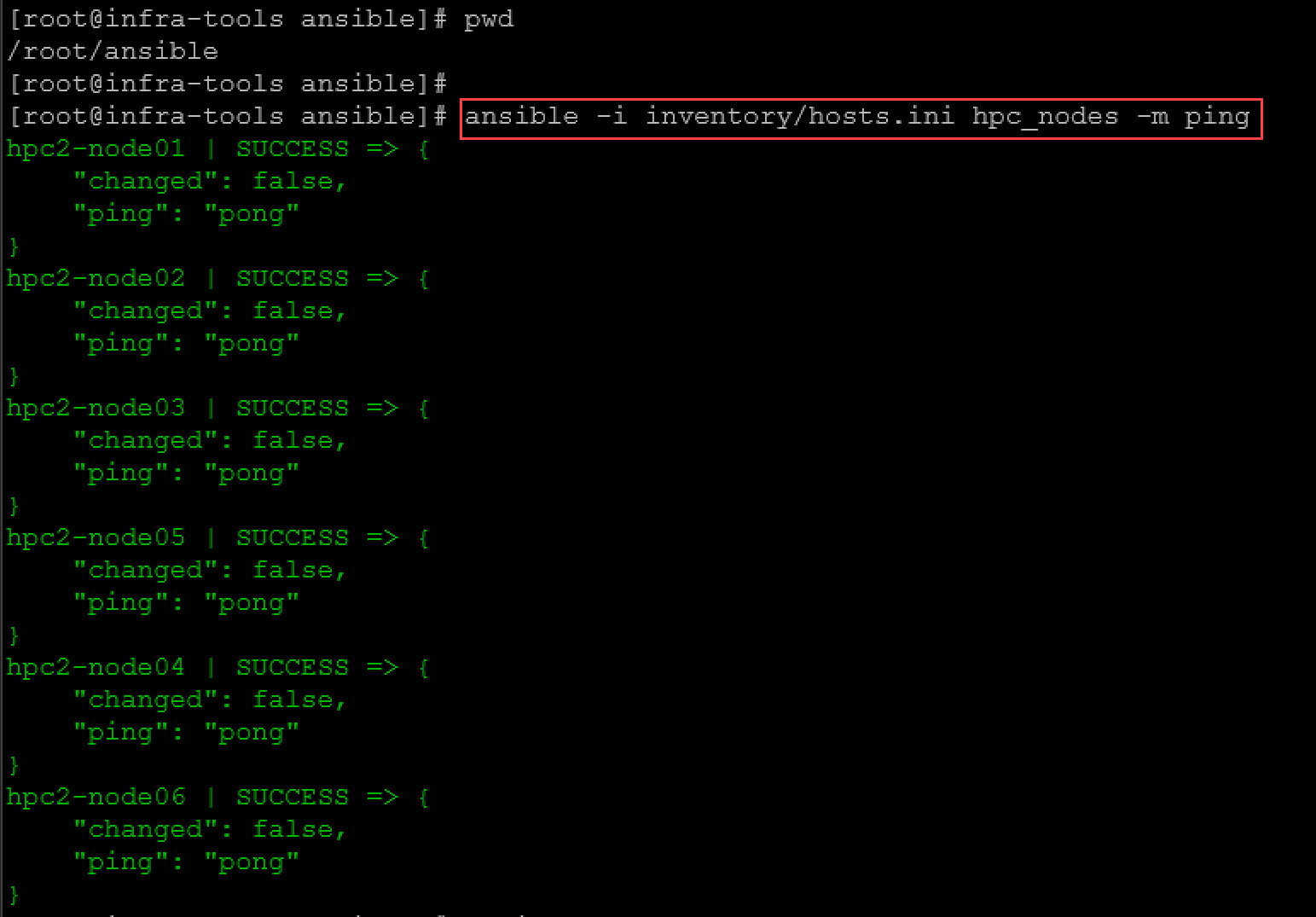 ansible -i inventory/hosts.ini hpc_nodes -m ping