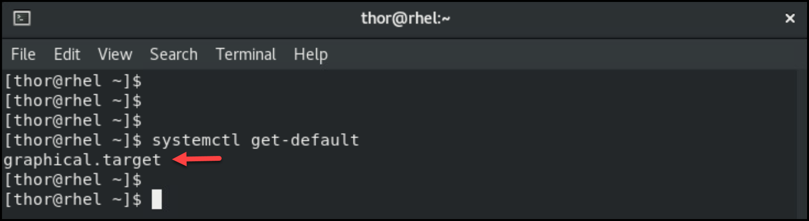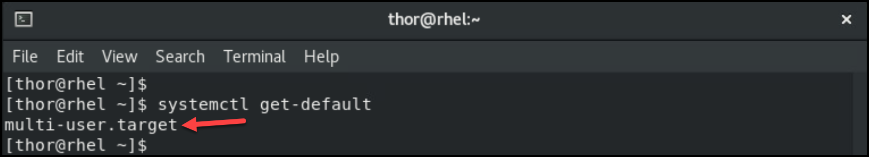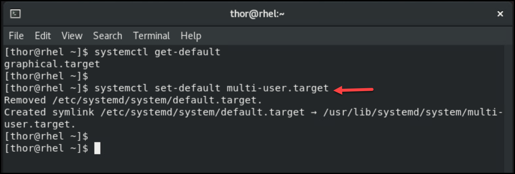 4- Check again what the default target is – look that the default target has been changed successfully to “multi-user.tager”: