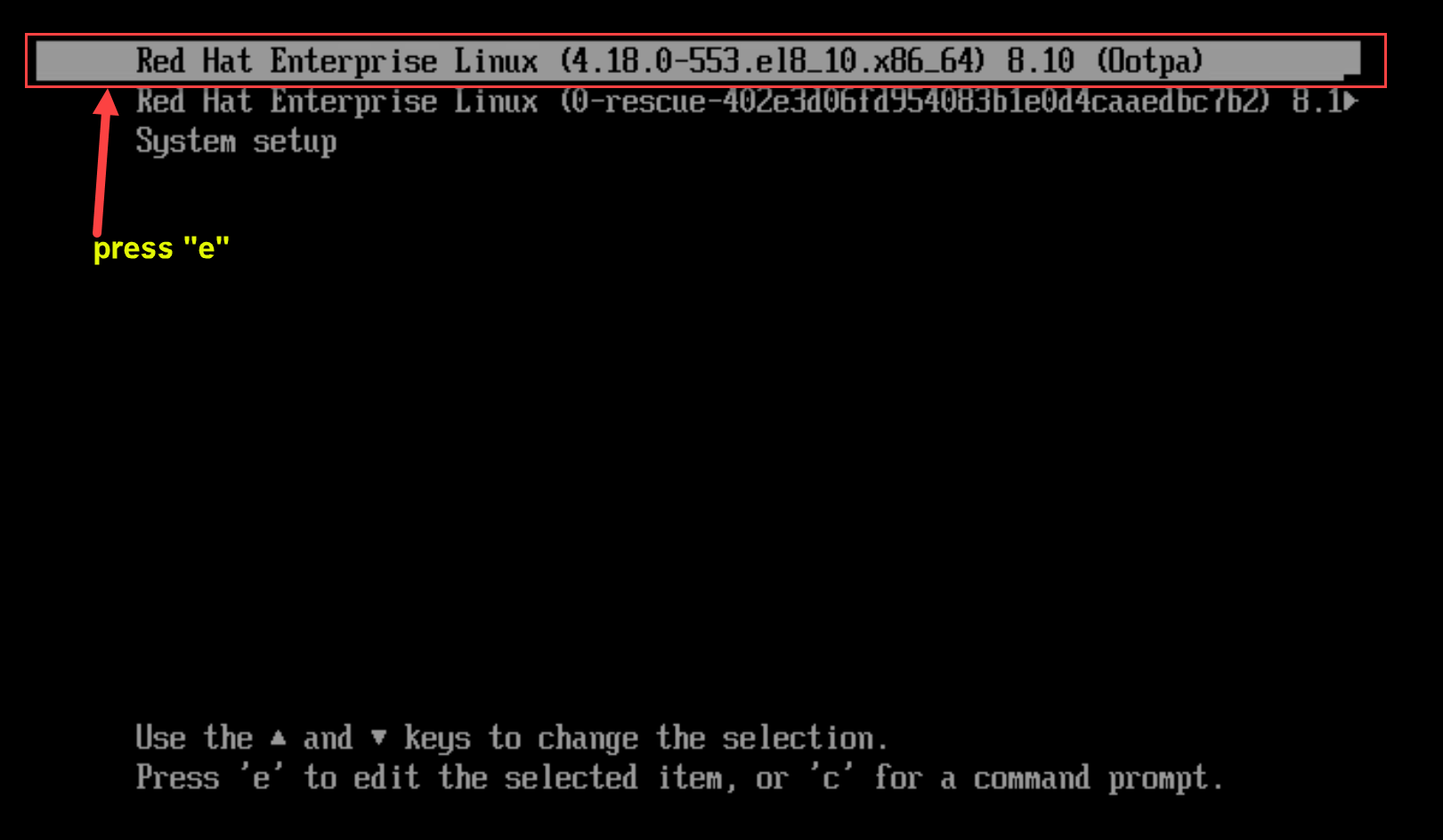 1- Reboot the system, and interrupt the boot loader menu countdown by pressing any key except the Enter key, which would initiate a normal boot. Press the “e” key to edit the current entry: