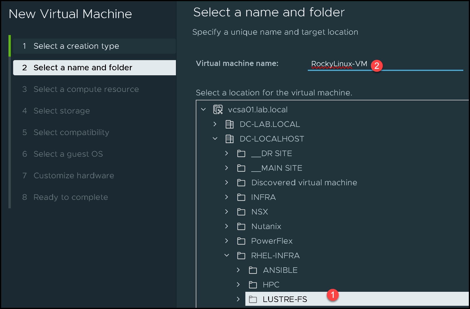 Select the folder to create the virtual machine in, and then type the virtual machine name. In our example, the virtual machine name is “RockyLinux-VM”: