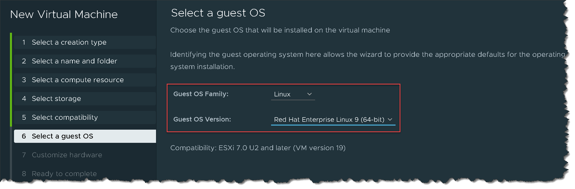 Under “Select a guest OS”, we can choose CentOS or Red Hat. In this case, we’re choosing Red Hat Enterprise Linux 9: