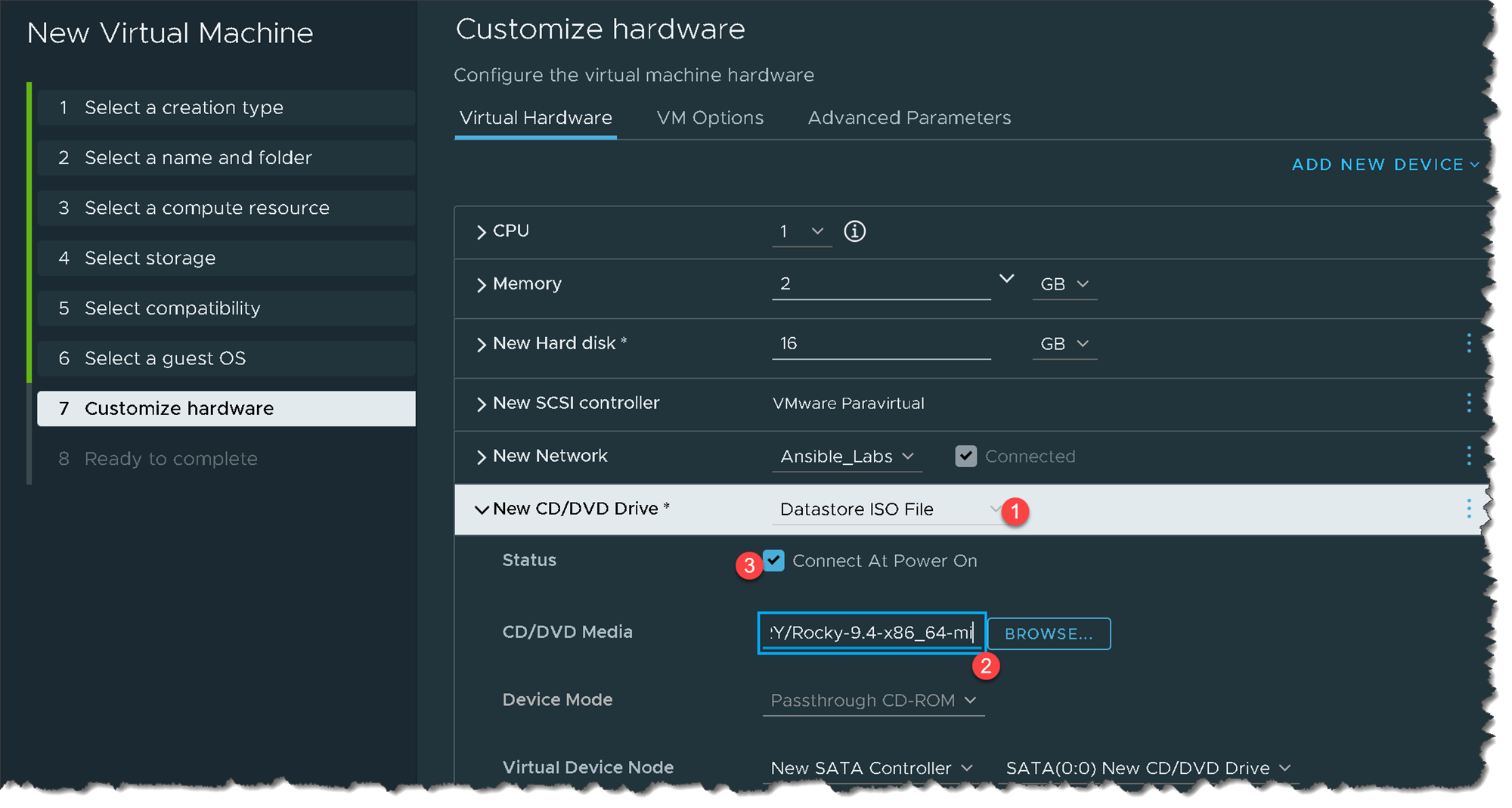 Under “Customize hardware”, there is an essential configuration to do: Under “New CD/DVD Drive”, we need to attach the Rocky Linux installation file (ISO file).