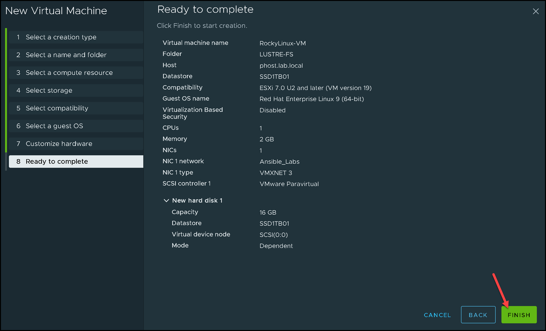 Click on “Finish” to complete the virtual machine creation wizard:
