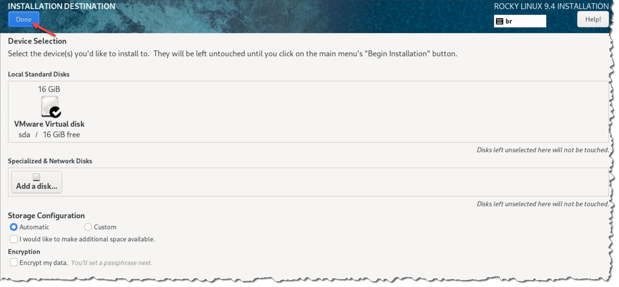 Click under “Installation Destination” to configure the disk partition layout. In this case, for instance, we’re using the “automatic” mode. Just keep the default values and click on “Done”: