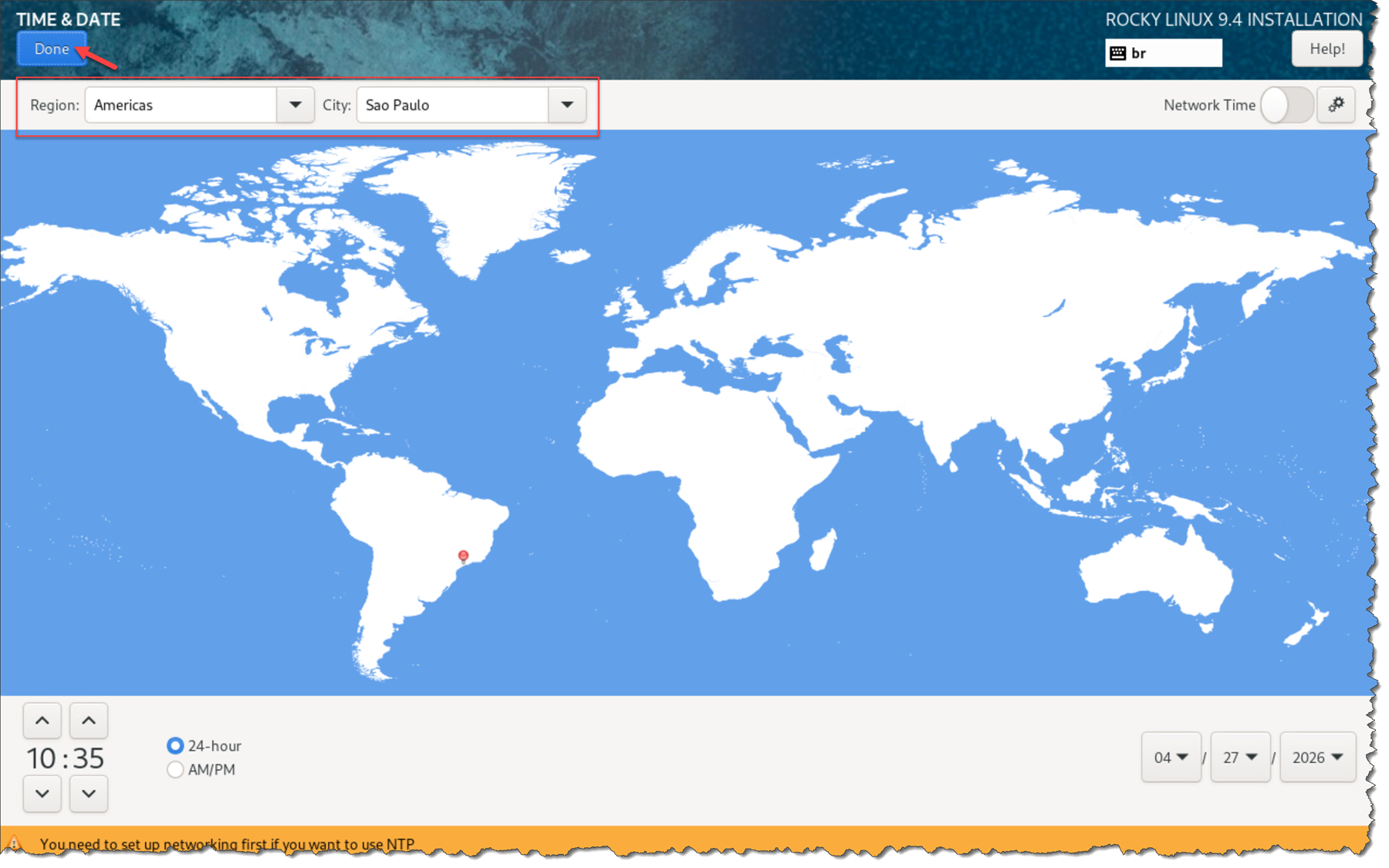 Under “Time & Date”, adjust the region and city and click “Done” to proceed: