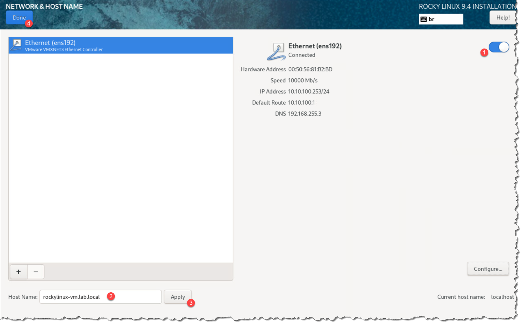 Next, slide the button to the right to enable the network connection, type a system hostname, and click “Done”: