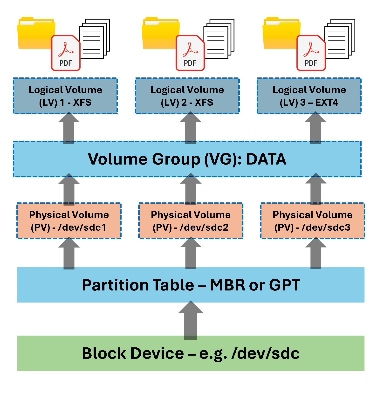 - Volume Group (VG): A pool of one or more PVs. Think of it as a storage bucket.
