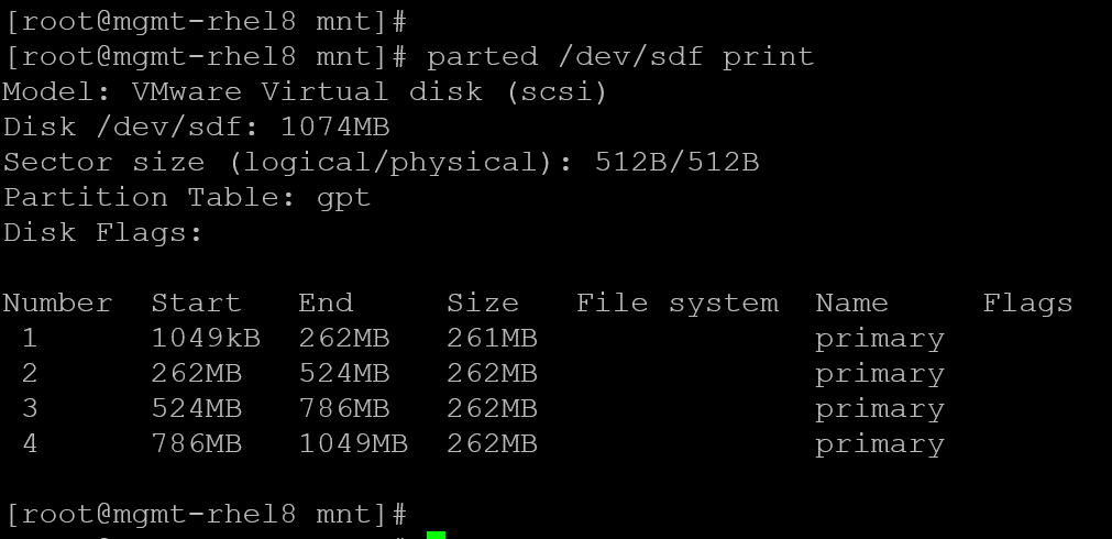 parted -s /dev/sdf mkpart primary xfs 750MiB 1000MiB