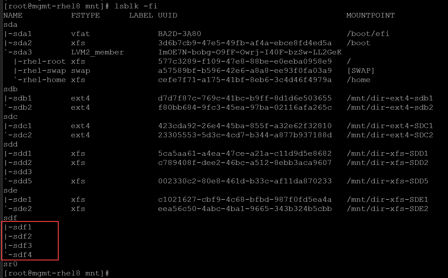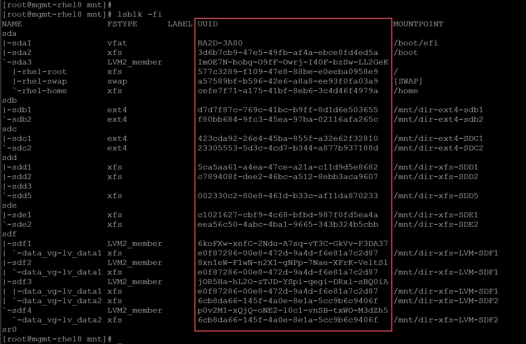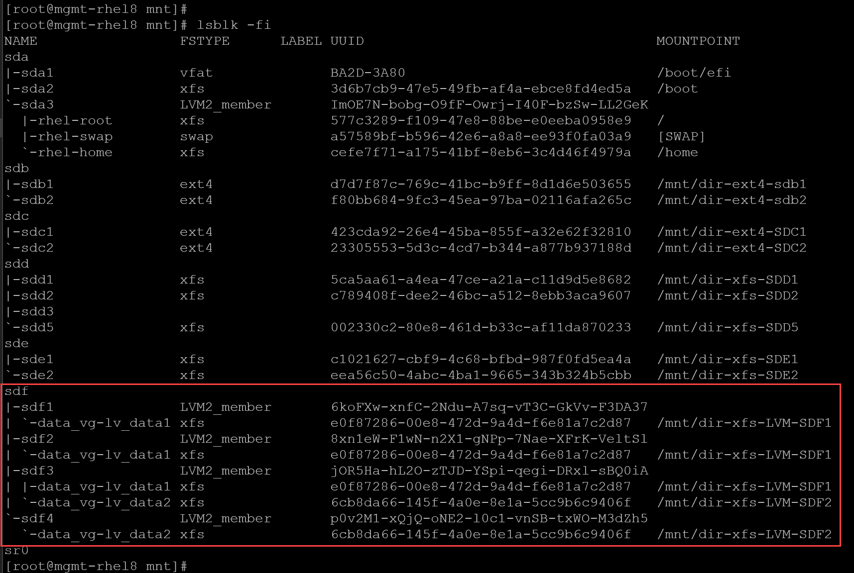 UUID=e0f87286-00e8-472d-9a4d-f6e81a7c2d87 /mnt/dir-xfs-LVM-SDF1 xfs defaults 0 0