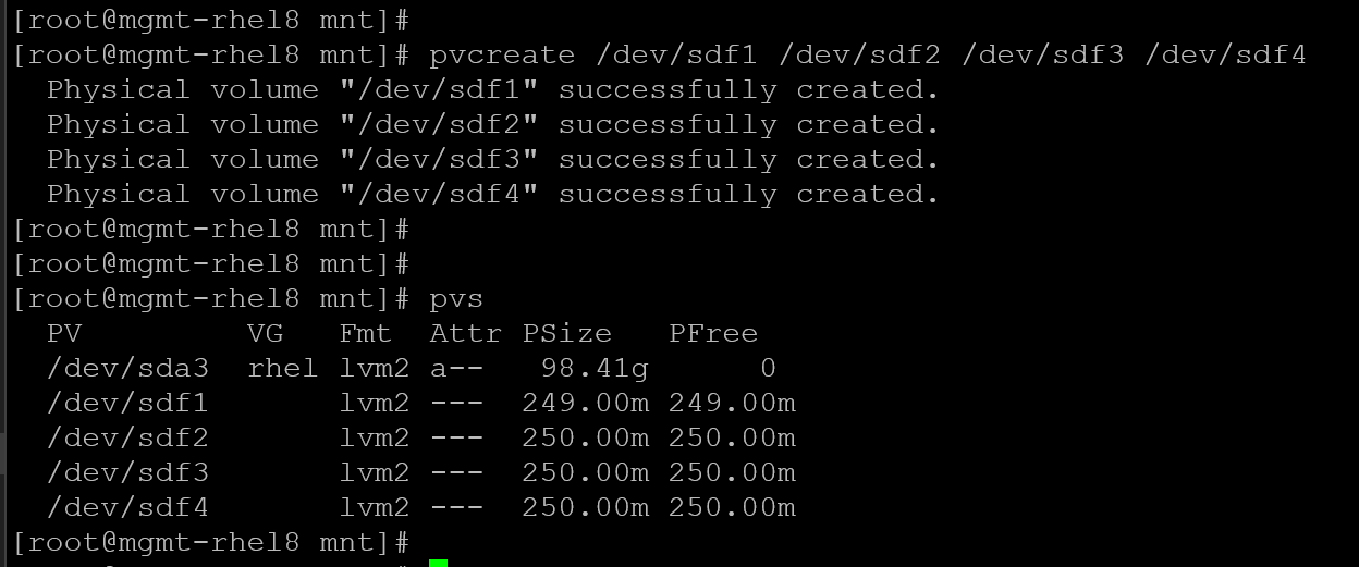 pvcreate /dev/sdf1 /dev/sdf2 /dev/sdf3 /dev/sdf4