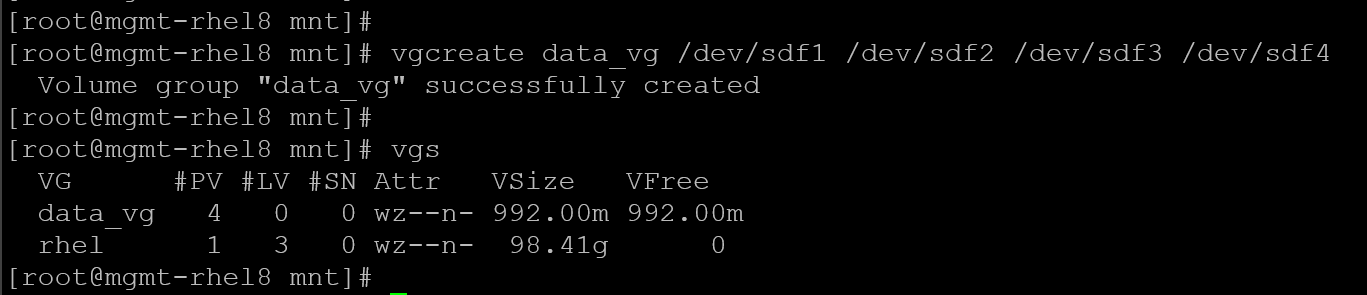 vgcreate data_vg /dev/sdf1 /dev/sdf2 /dev/sdf3 /dev/sdf4