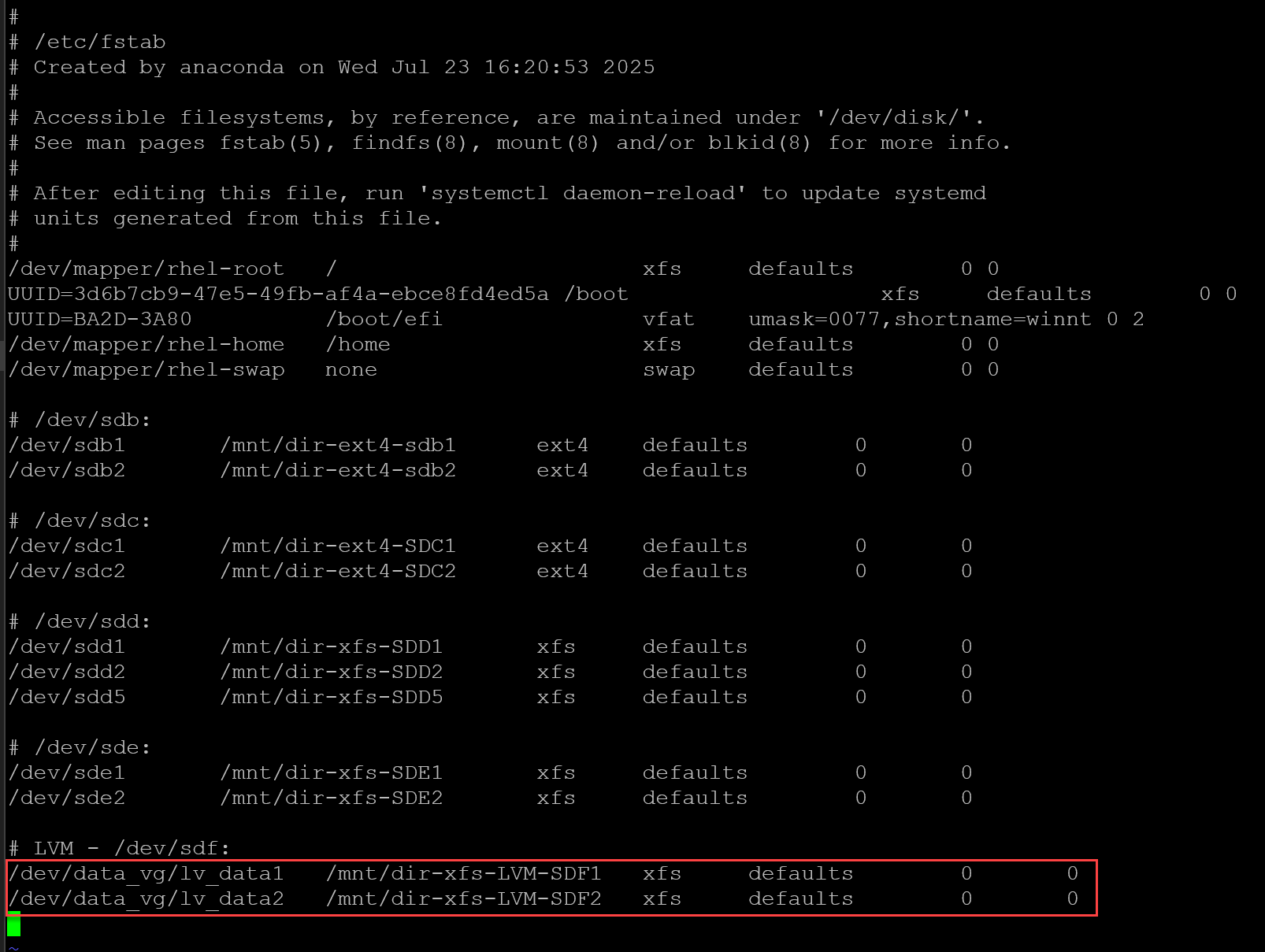 /dev/data_vg/lv_data2 /mnt/dir-xfs-LVM-SDF2 xfs defaults 0 0
