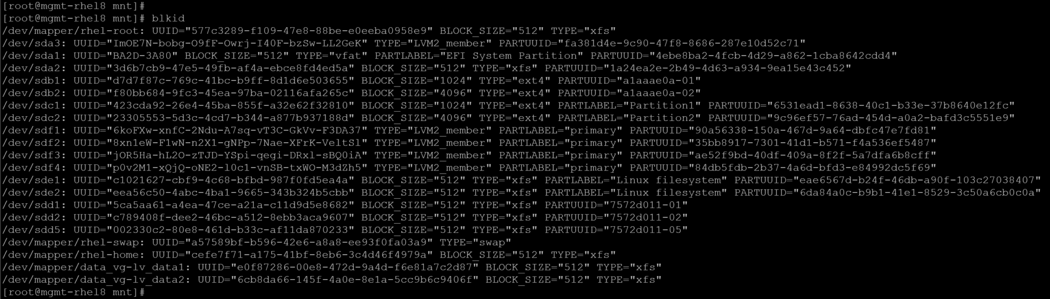 So, let’s get the UUID for the Logical Volumes (LV) and mount them using it: