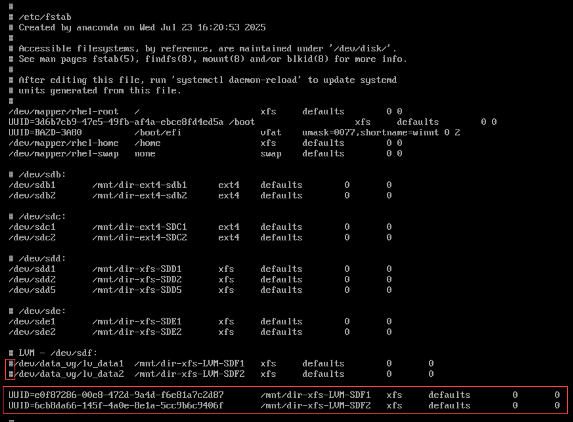 UUID=6cb8da66-145f-4a0e-8e1a-5cc9b6c9406f /mnt/dir-xfs-LVM-SDF2 xfs defaults 0 0