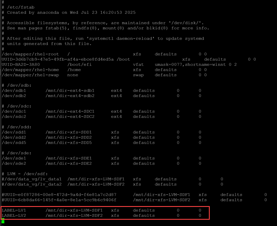LABEL=LV2 /mnt/dir-xfs-LVM-SDF2 xfs defaults 0 0