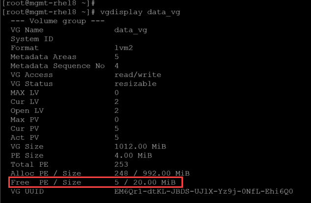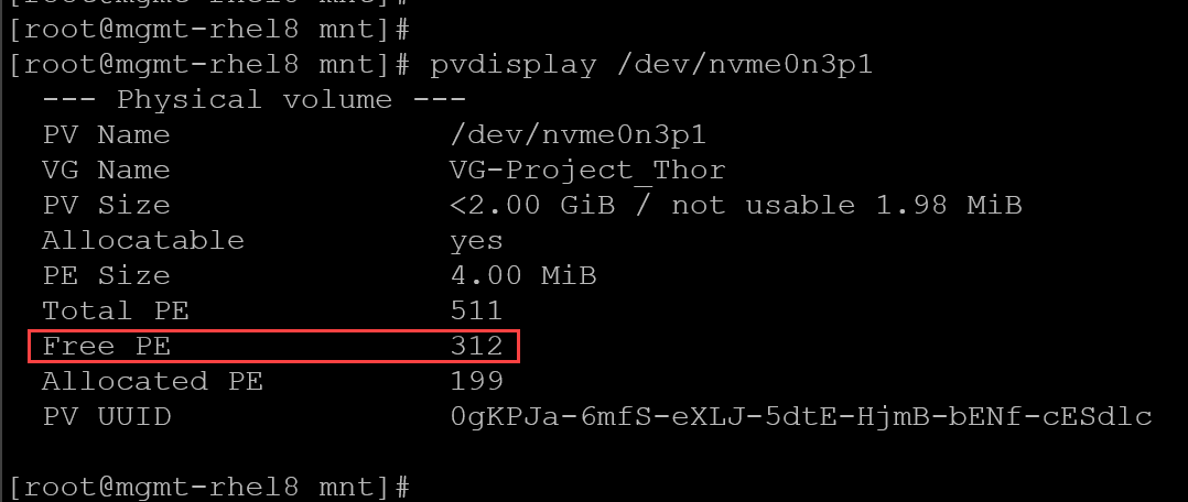 Inspect the Physical Volume (PV) to confirm the “Free PE”: