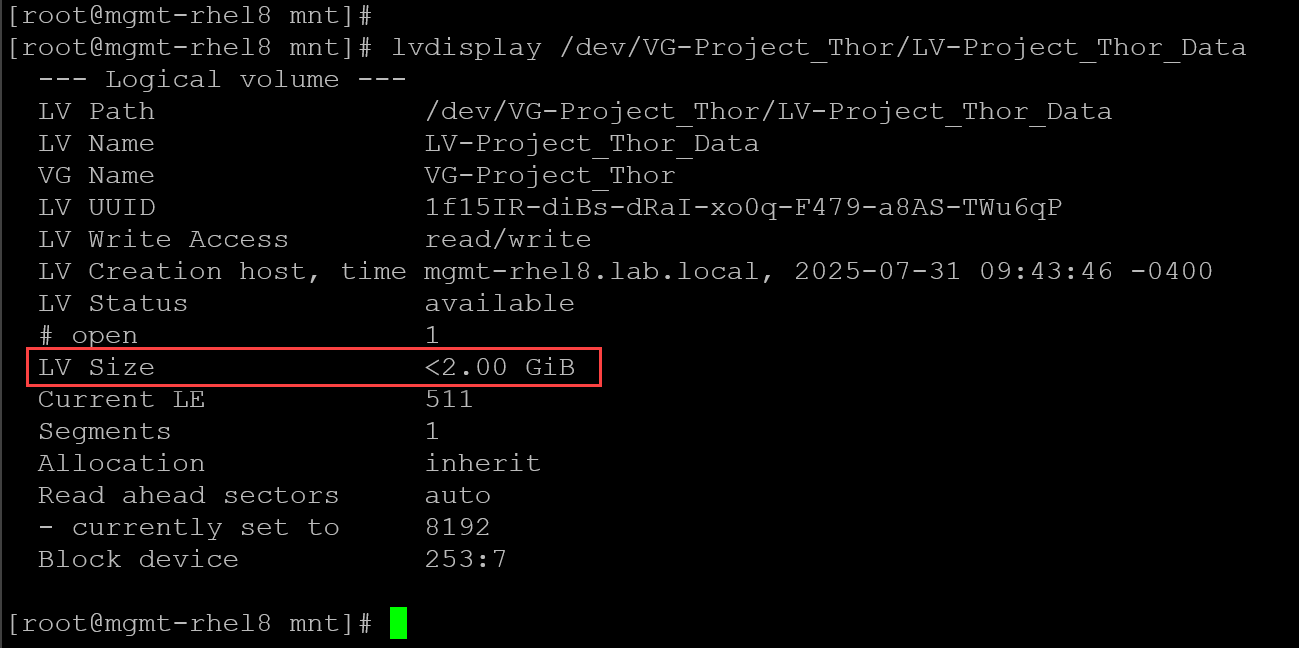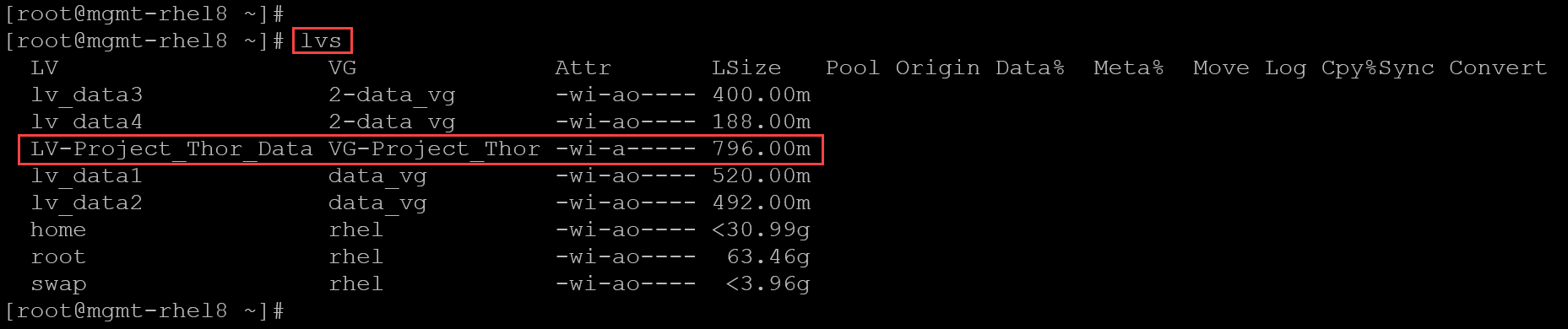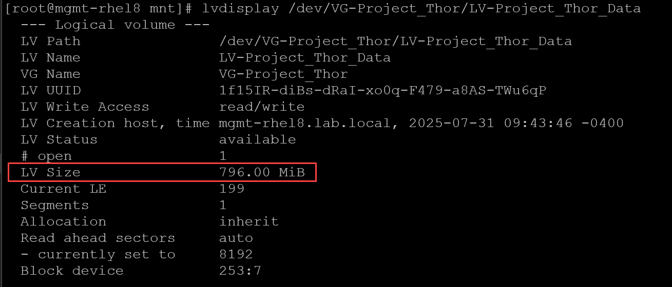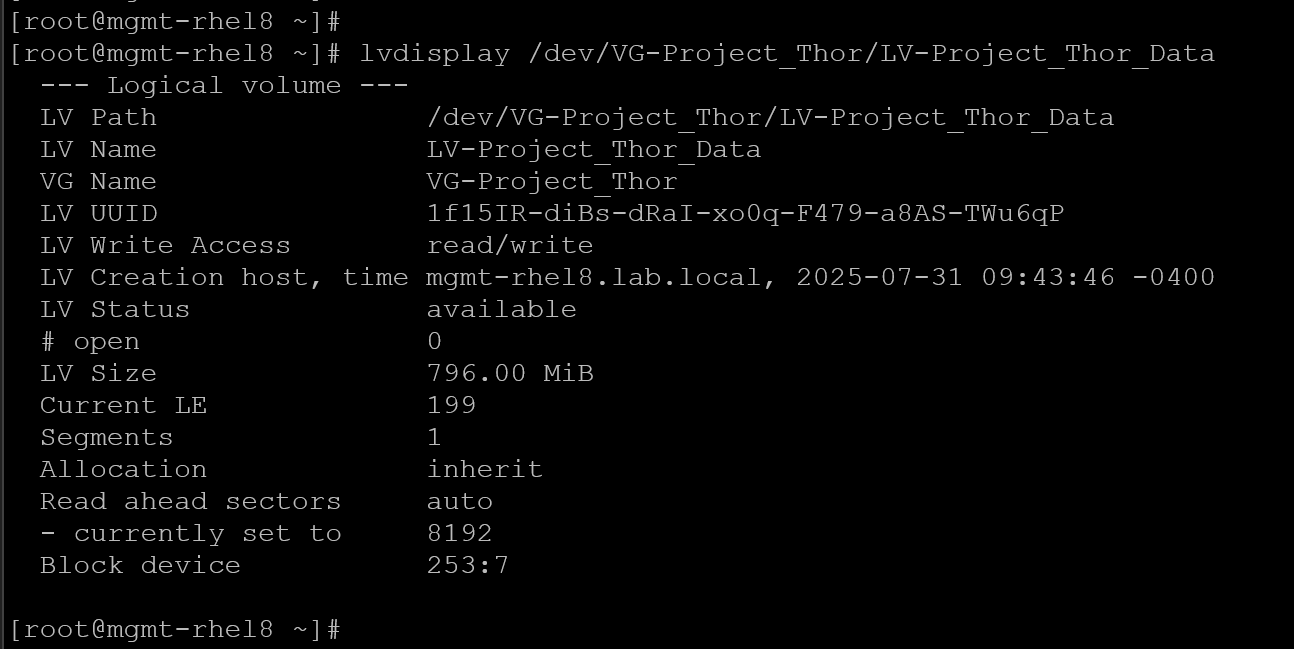 lvdisplay /dev/VG-Project_Thor/LV-Project_Thor_Data