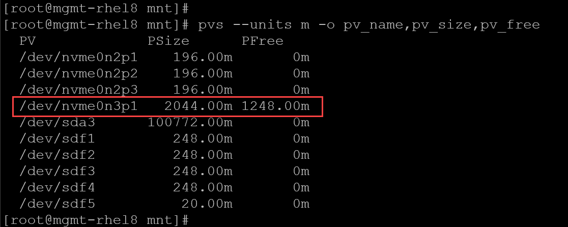 pvs --units m -o pv_name,pv_size,pv_free