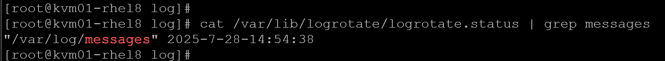 After executing the previous command, we can check on the file “/var/lib/logrotate/logrotate.status” to see what the last rotation was for the configuration file “/etc/logrotate.d/messages”: