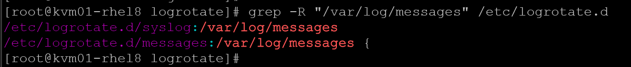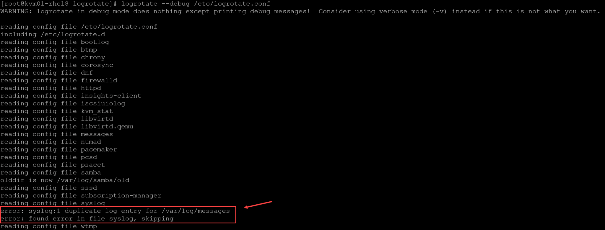 In our case, after executing the logrotate with debug, an error was found related to the “/var/log/messages” – It was found a duplicate entry for this file: