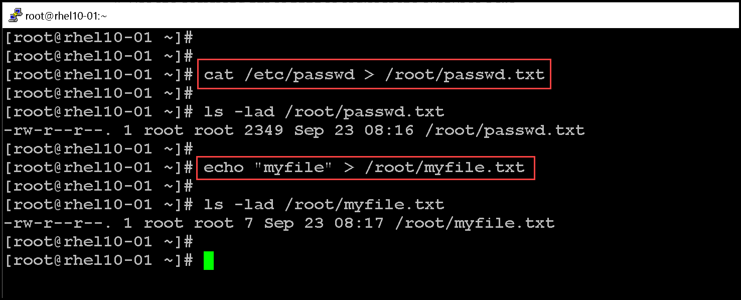 - Use the command cat or echo to redirect the output to a file.
