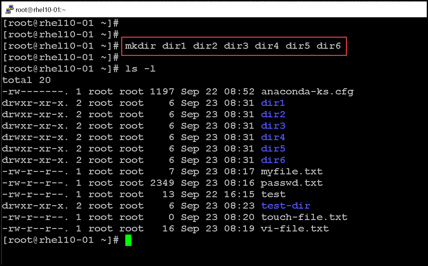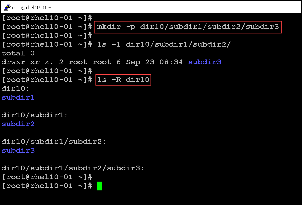 The mkdir command is used to create directories and subdirectories. Let’s provide some examples: