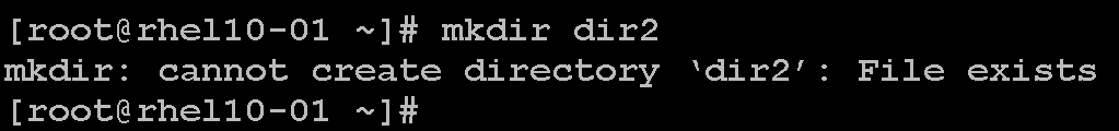 If you try to create an existing directory, the mkdir command will fail, and an error will be shown: