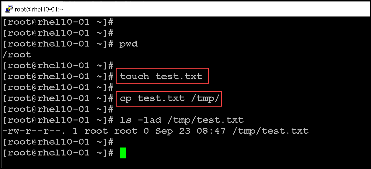 1- Creating a test.txt file in the root home directory and copying it to the /tmp directory: