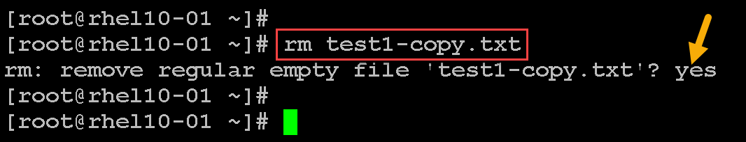 1- Let’s remove the file test1-copy.txt. By default, a confirmation will be asked before removing the file – we must type “yes” to confirm the file removal: