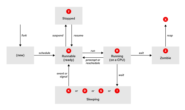 Running | R | TASK_RUNNING: The process is either executing on a CPU or waiting to run. The process can execute user routines or kernel routines (system calls), or be queued and ready when in the Running (or Runnable) state. |