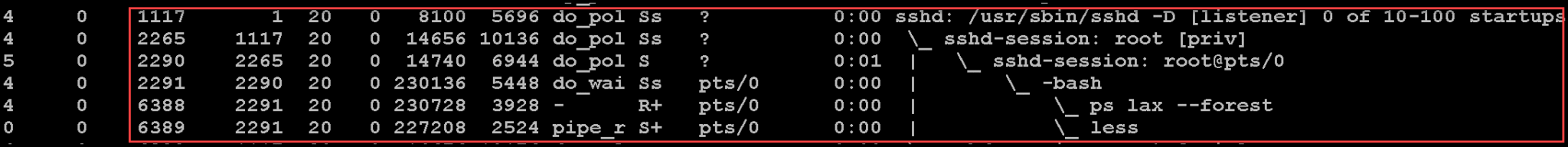- The SSH session opened by the root user has a process ID (PID) of 2265. Note that the PPID for it is the main SSHD process (PPID of 1117).