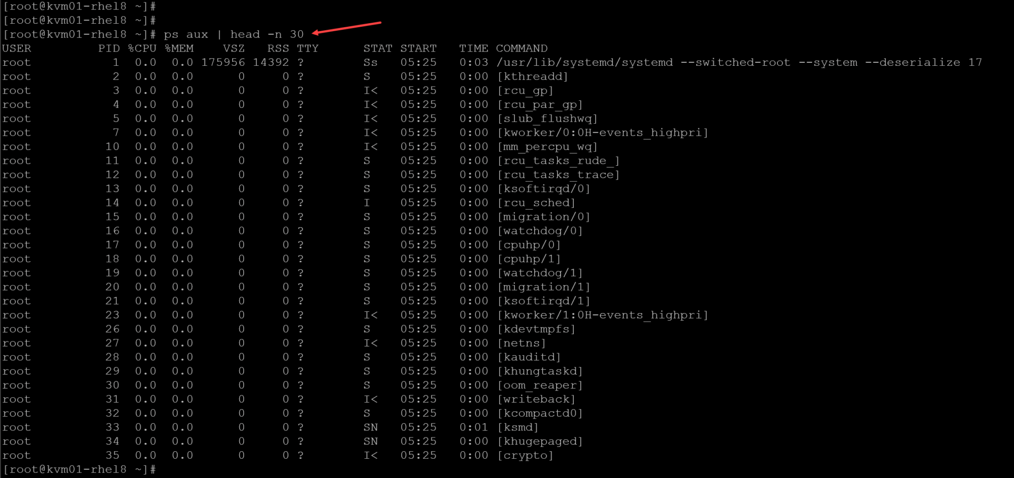Following ahead, we can use the command “ps aux” to get details of all processes running in the system: