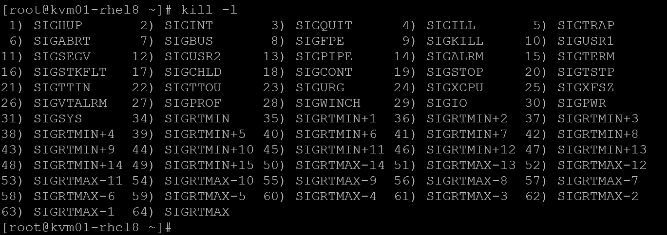 The “kill” command provides several signals that we can send to a process to terminate it. The “kill -l” shows all available signals:
