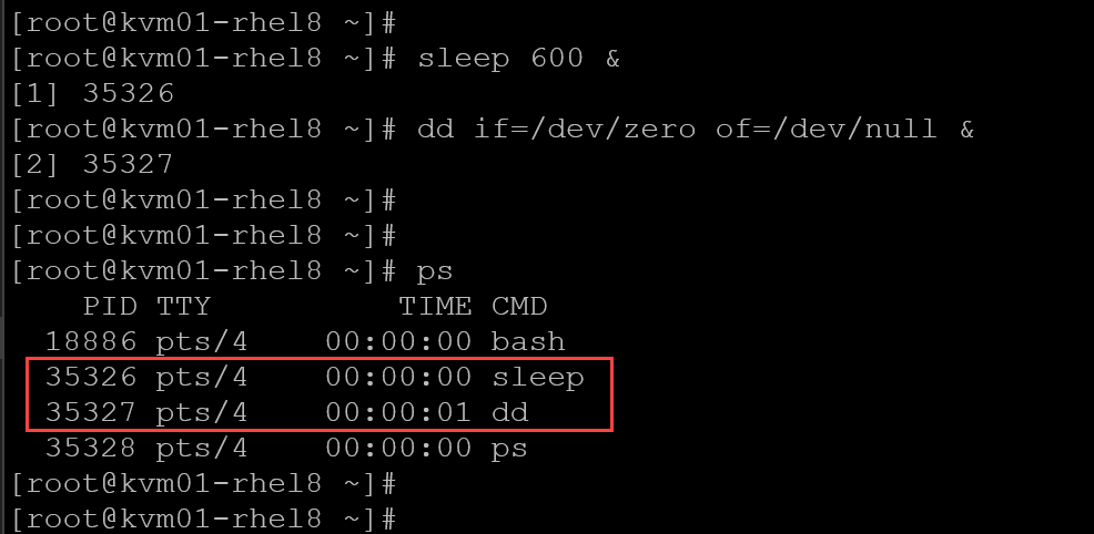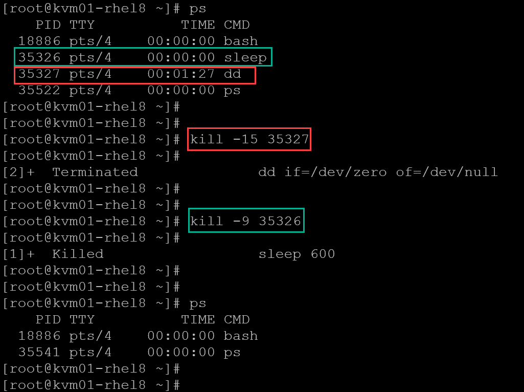 Let’s terminate the “dd” process with the “SIGTERM” and the “sleep” process with “SIGKILL”: