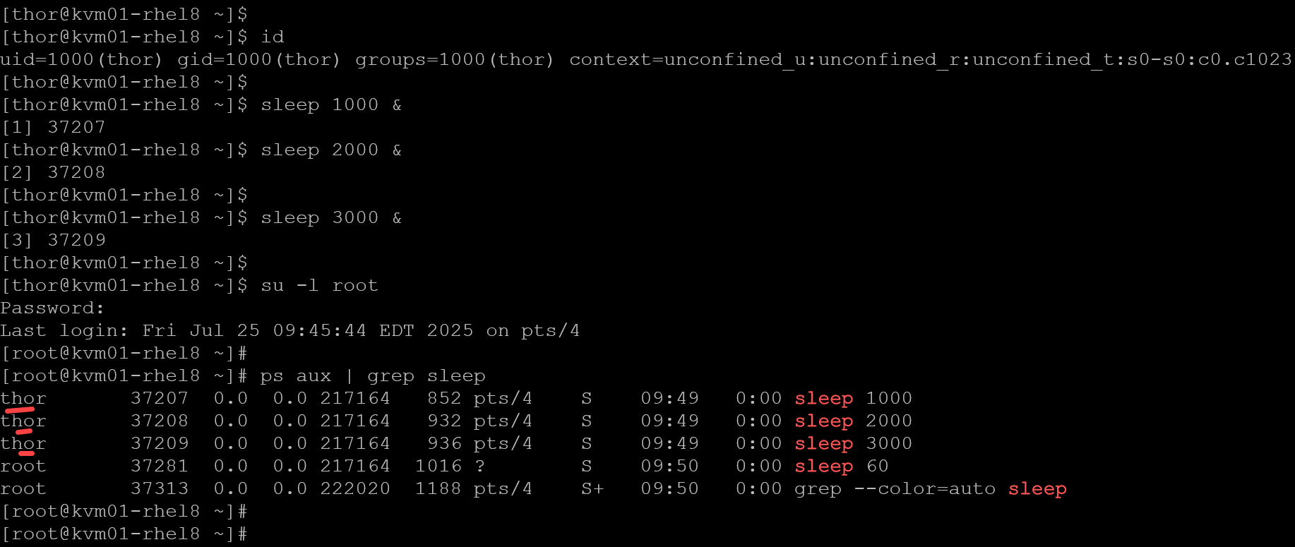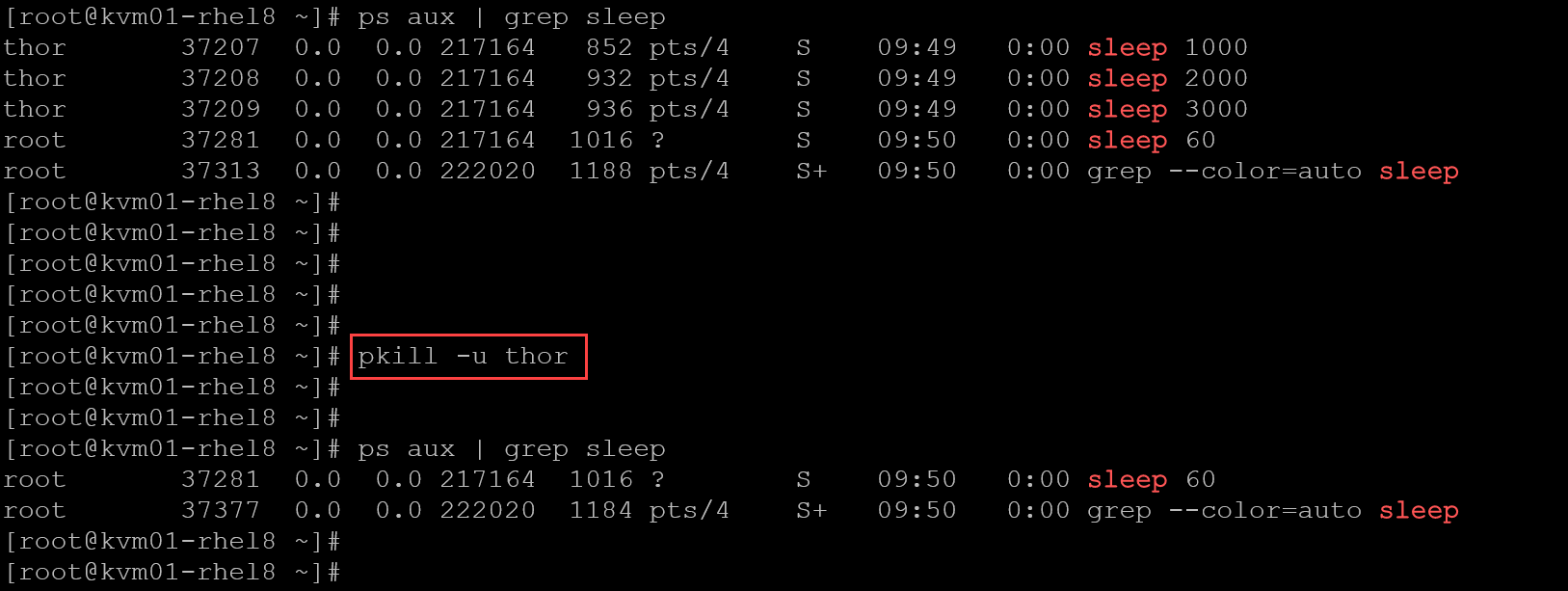 As shown in the above picture, in this example, three “sleep” processes were started by the “thor” user.