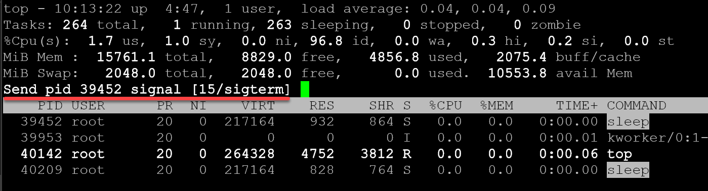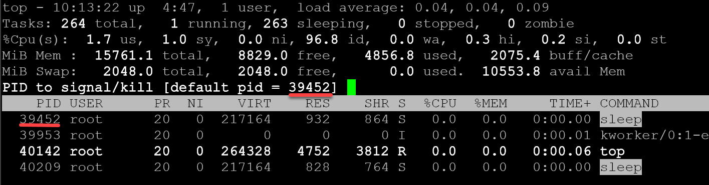 To kill the first “sleep” process (in our case, the process with PID 39452), press k.