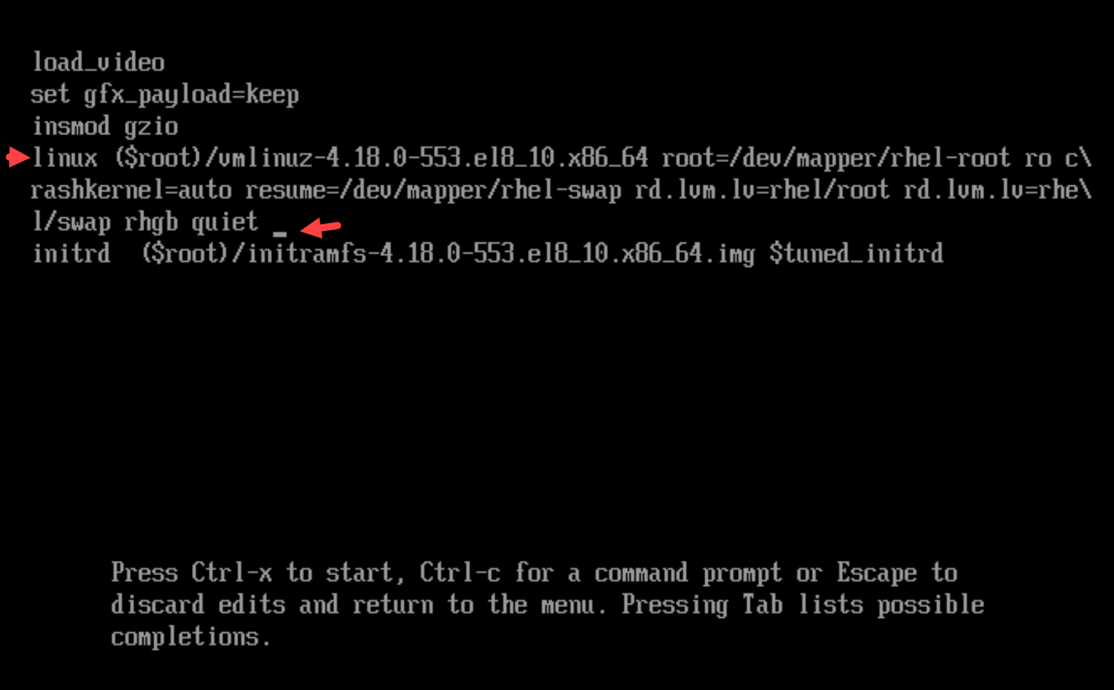 4- Press Ctrl+x to start the system with the changed parameters. The switch_root