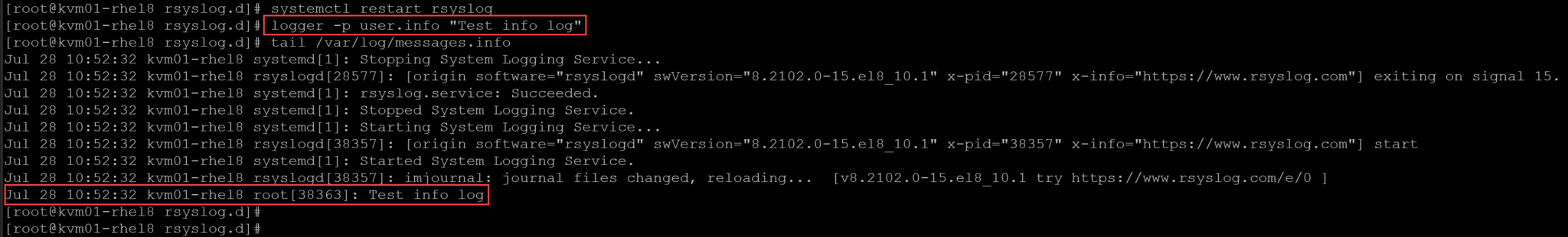 2- Restart the rsyslog daemon and make a test using the program logger: