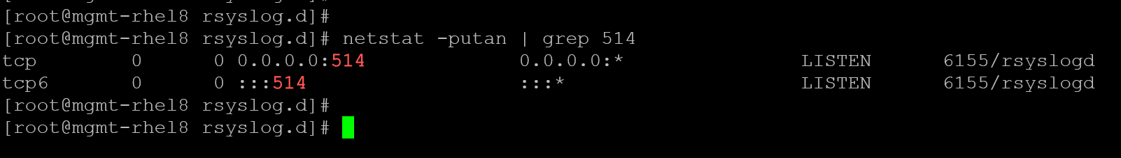 3- Restart the rsyslog service on both client and server, and check if TCP/514 is listening on the server: