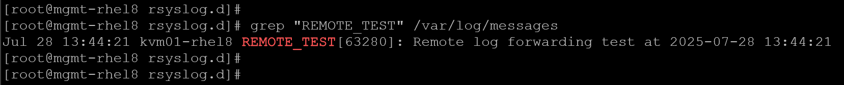 logger -p user.alert -t REMOTE_TEST "Remote log forwarding test at $(date '+%Y-%m-%d %H:%M:%S')"