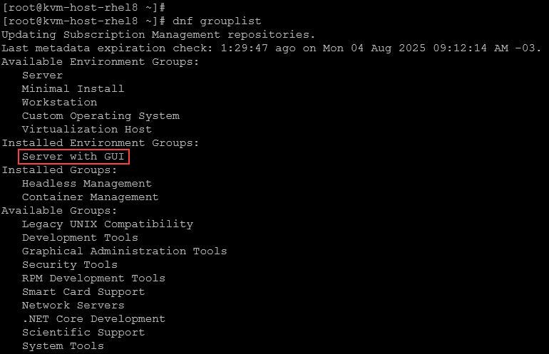 To use “virt-manager”, we need to have the graphical environment installed. We can check it with the following command: