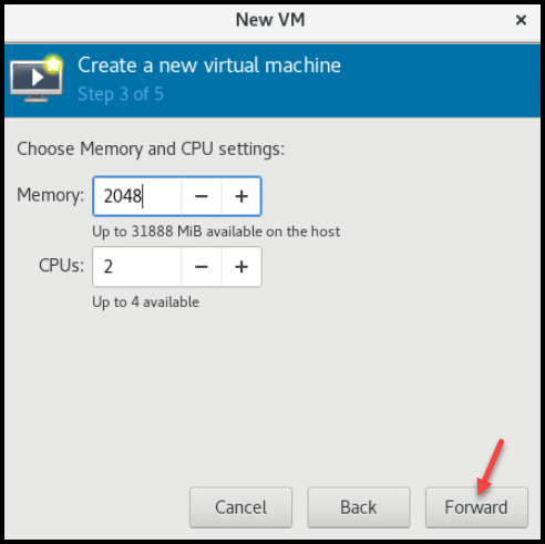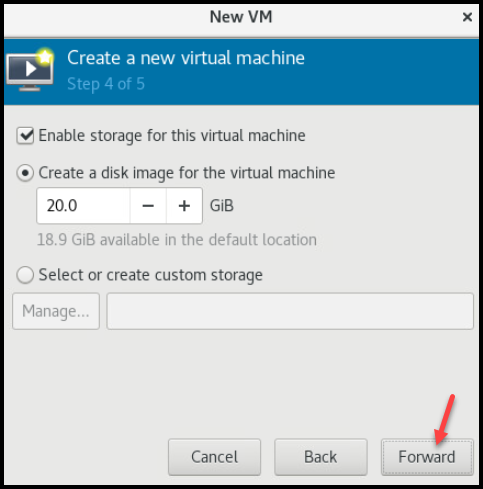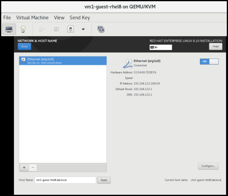 Under “Network &Hostname” configuration, check that the virtual network interface got an IP address from the network 192.168.122.0/24. By default, this is the network for the NAT network (internal network) used by the KVM to lease IPs from the virtual machines.