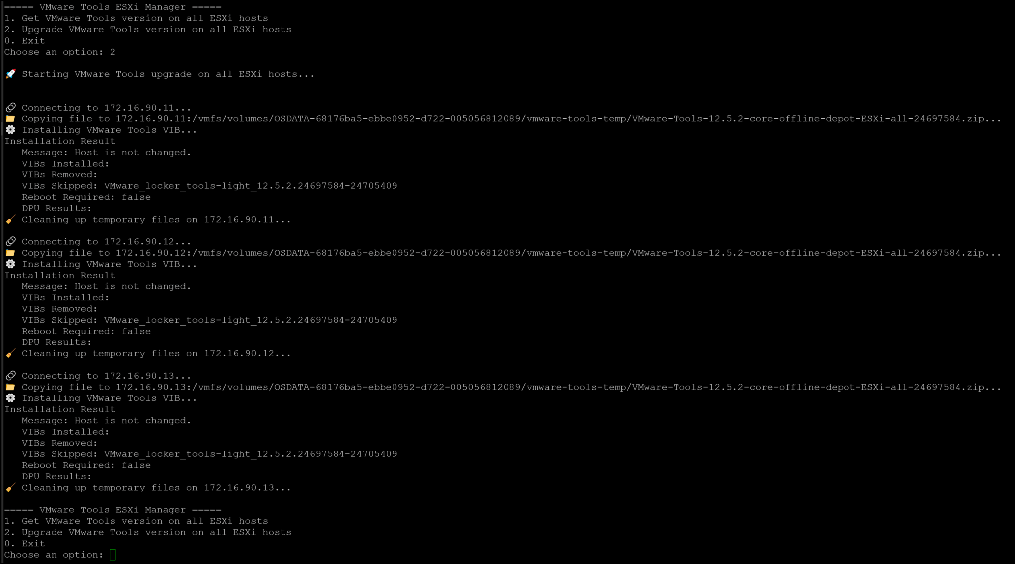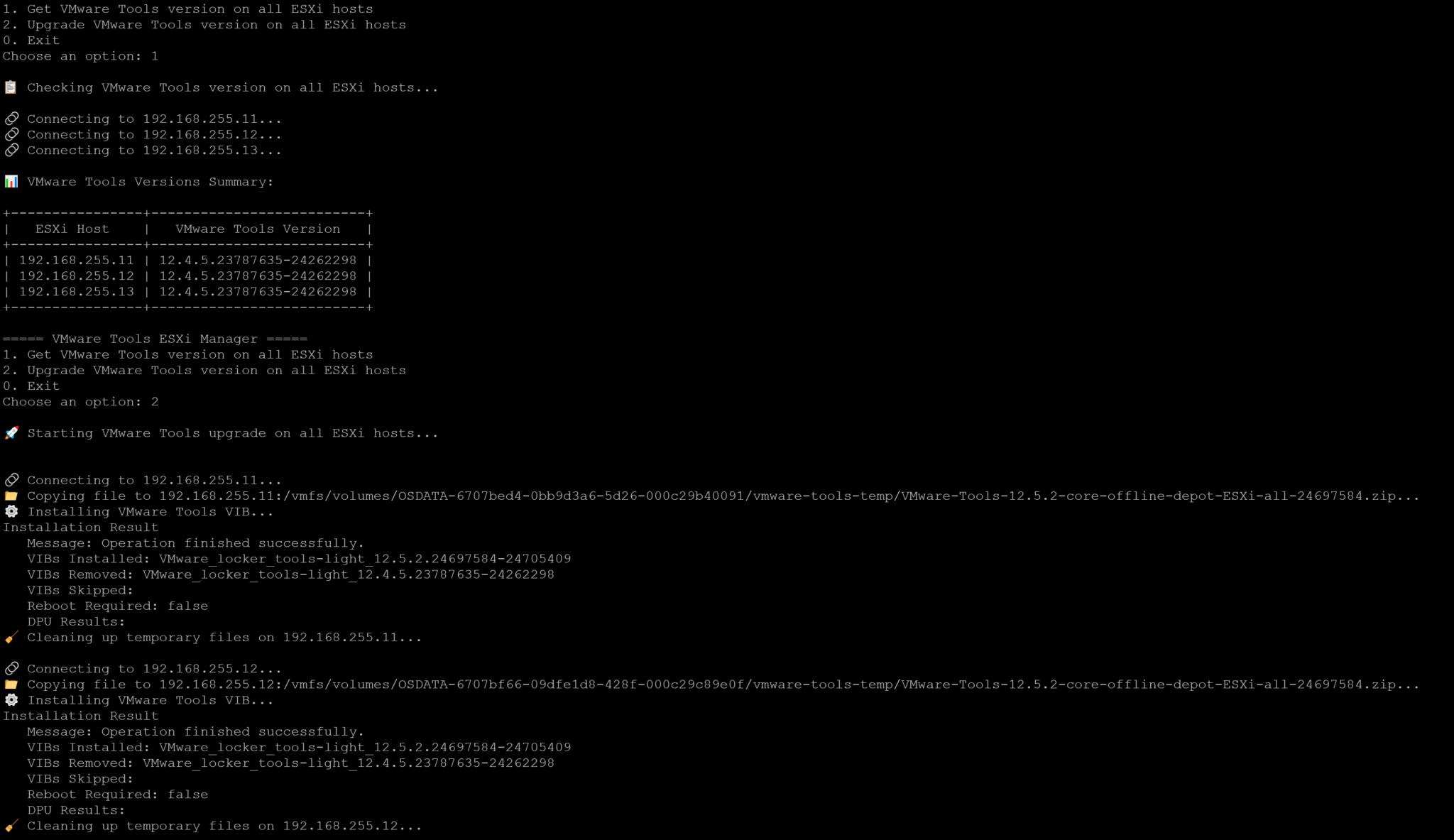 When choosing option 2, the script will copy and install the VMware Tools Offline VIB Bundle (.zip). Afterward, a cleaning task will be executed to remove this file. In the following example, I previously executed ii and upgraded it: