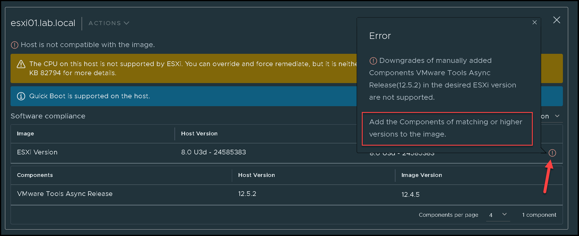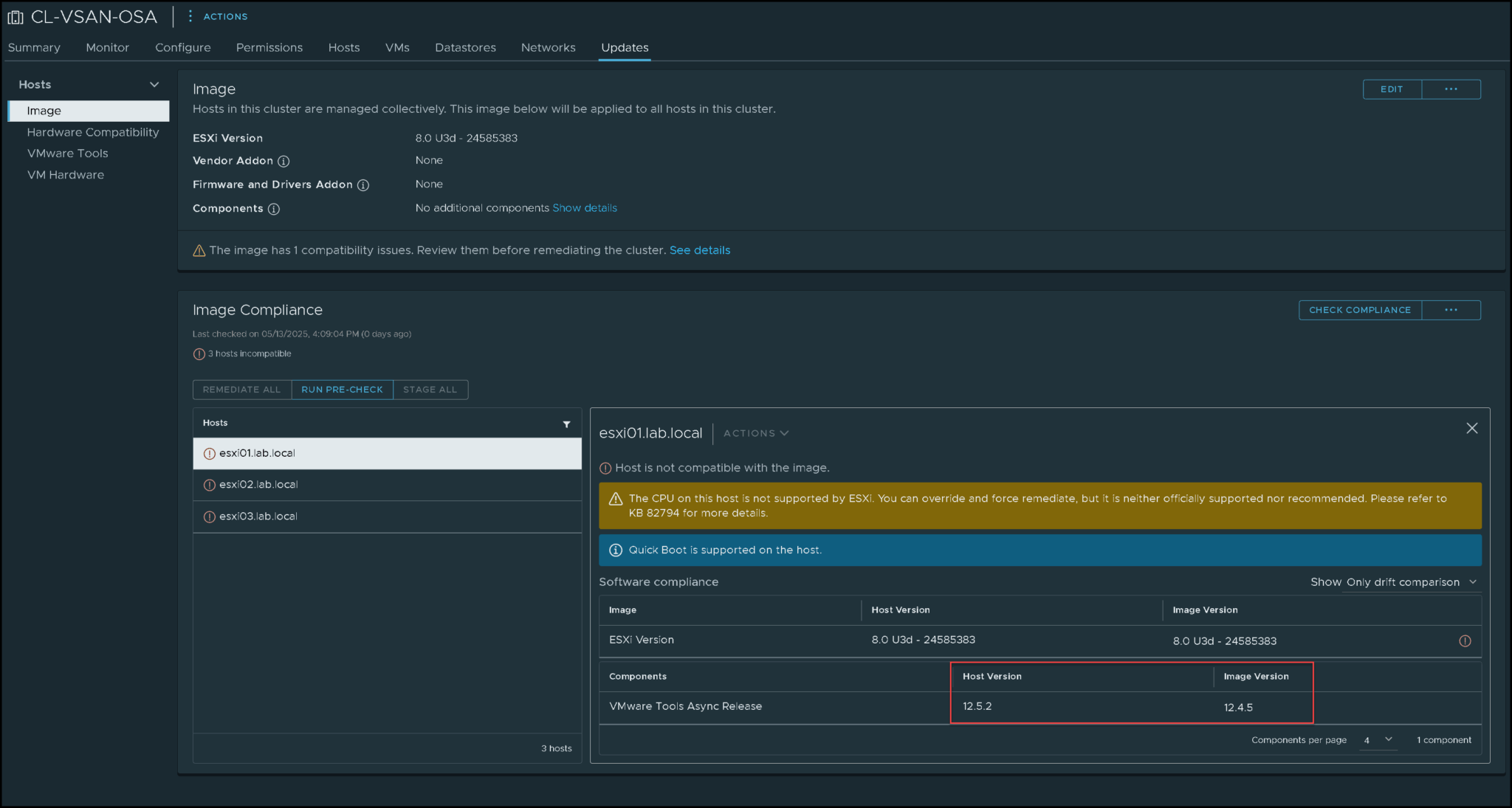An additional warning, if you are using a cluster image, after upgrading the VMware Tools on all ESXi hosts, they will not be compliant with the image configuration (it is expected to happen):