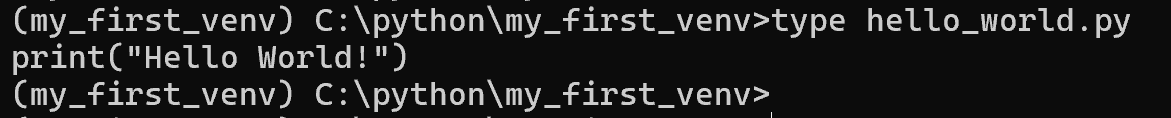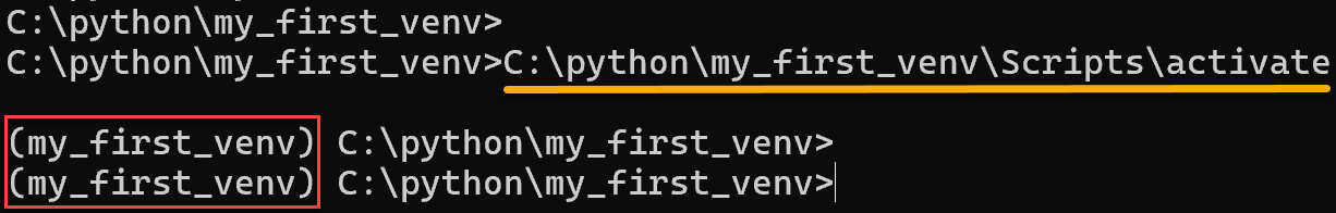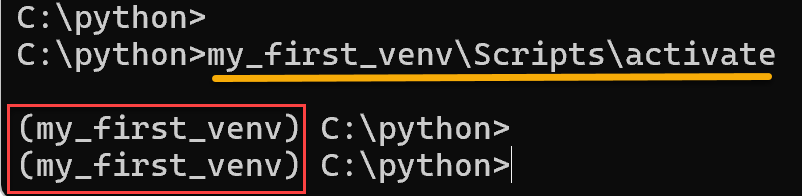 After activating the venv, the prompt command was changed and added the venv name at the initial – it indicates that the venv was enabled successfully: