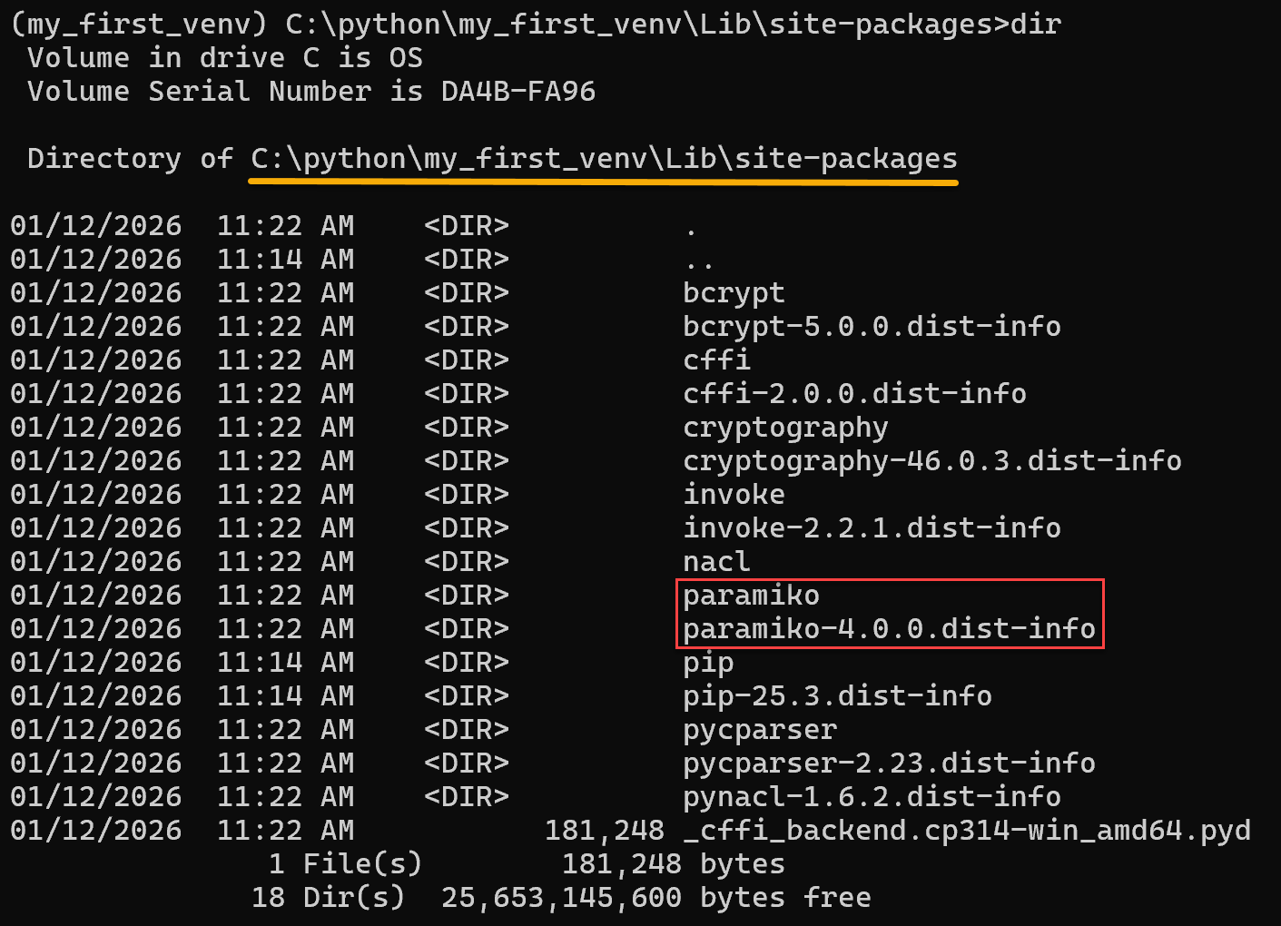 Inside the “Lib\site-packages” on the venv directory, we can see the paramiko packages: