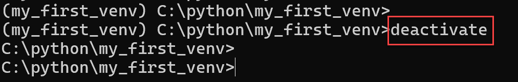 Note: Look at the command prompt – the Python venv name is removed from it after deactivating!