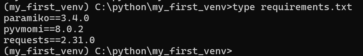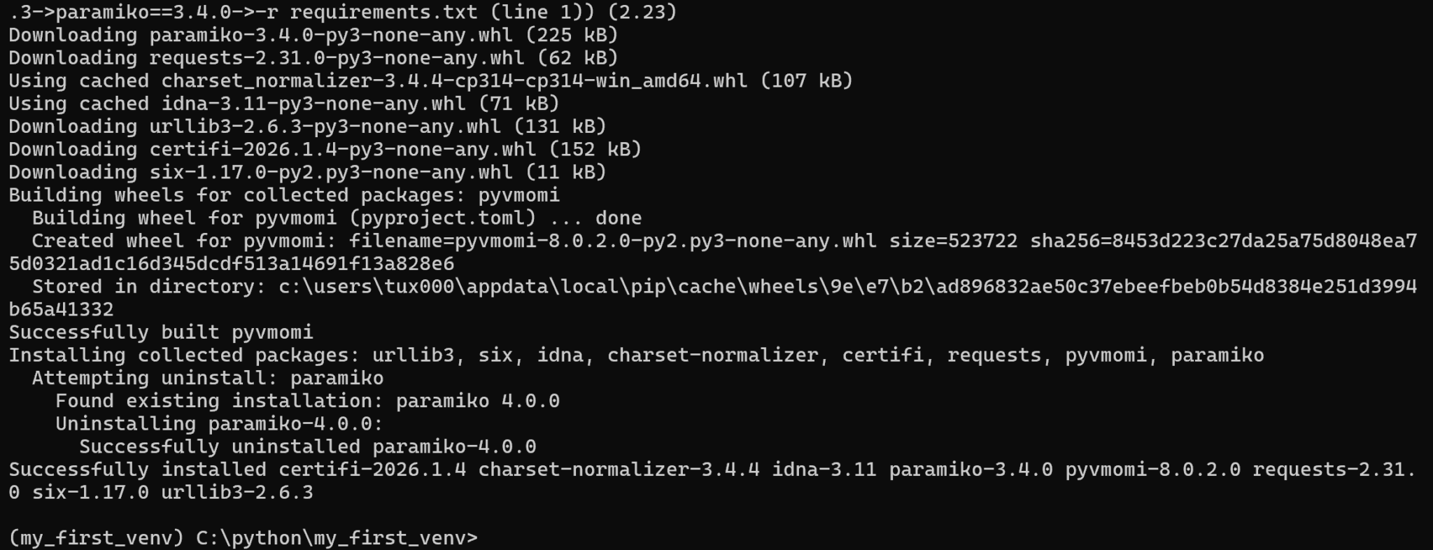 As we can see, our requirements file lists the modules paramiko, pyvmomi, and requests, along with their versions. To install these packages into the venv: